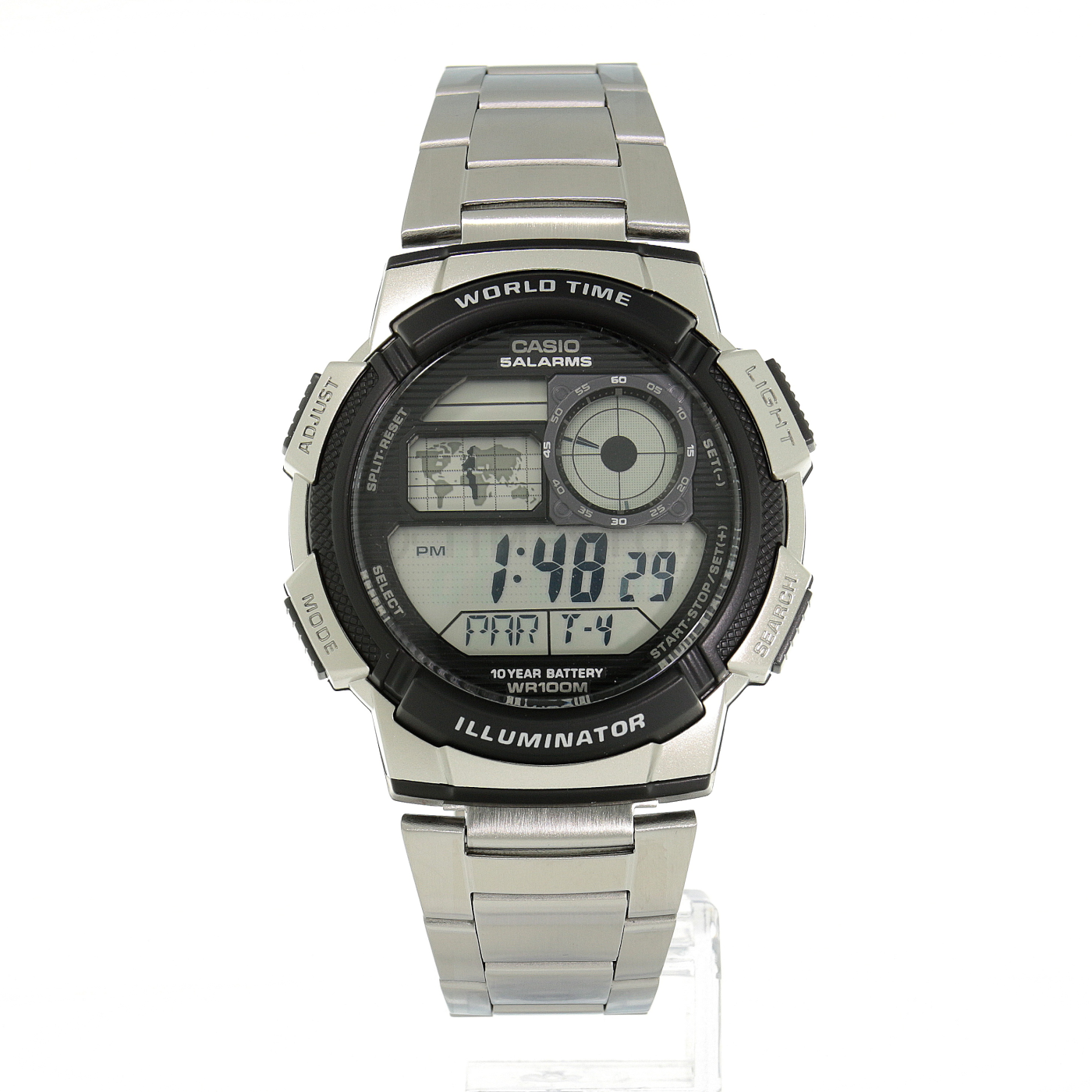 Összességében azt kell mondanom, hogy ennek az órának jó az ár-érték aránya. Műanyag kerete van, amelyet ezüstre fújtak, hogy acélnak tűnjön. Arra számítok, hogy a szín idővel elkopik. A keret csak felül és alul van megemelve, így az üvegek oldalon kilóg. A szíj sebészeti acélból készült, és inkább vékony. A szemeket nem lehet egykönnyen leválasztani. A csat szilárd, és négy lyukkal rendelkezik a méret beállításához. Az óra minden szükséges funkciója megvan, a vezérlés meglehetősen intuitív. Mutatja a világidőt, 31 időzóna közül lehet választani (beleértve azokat is, ahol csak fél órával változik az idő, mint például Afganisztán vagy Nowfoundland). Az időzóna térkép kicsit használhatatlan. A digitális kijelzőn 4 kiválasztott időzóna látható, de a dátum és az ébresztő csak a főképernyőn látható. Az analóg óra mindig az otthoni időzónát mutatja. Így egyszerre két zóna is megjeleníthető. A háttérvilágítás kissé egyenetlen, a kijelzőt egy 7:30 állásban elhelyezett LED világítja meg.