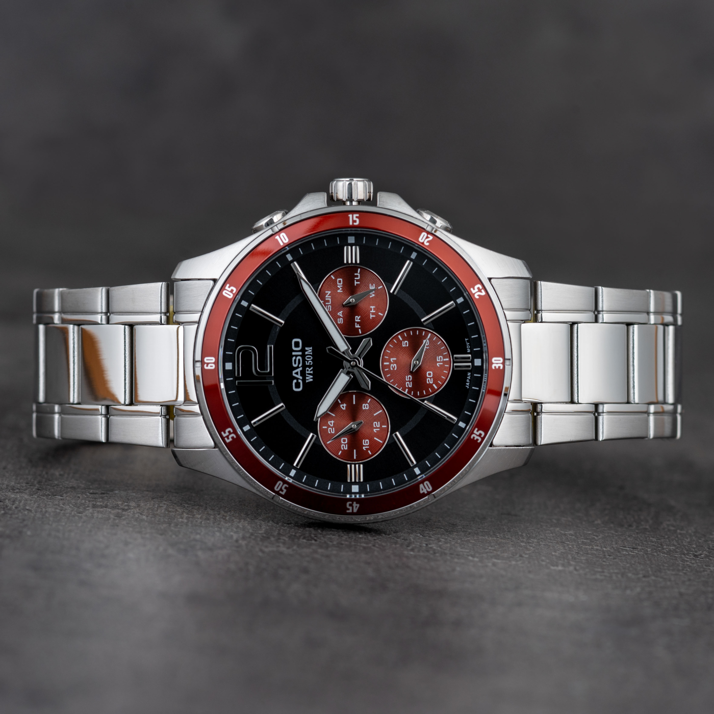 - Kronográf, Nap kijelző, 24 órás al-számlap, Lumineszcens mutatók, Stopper