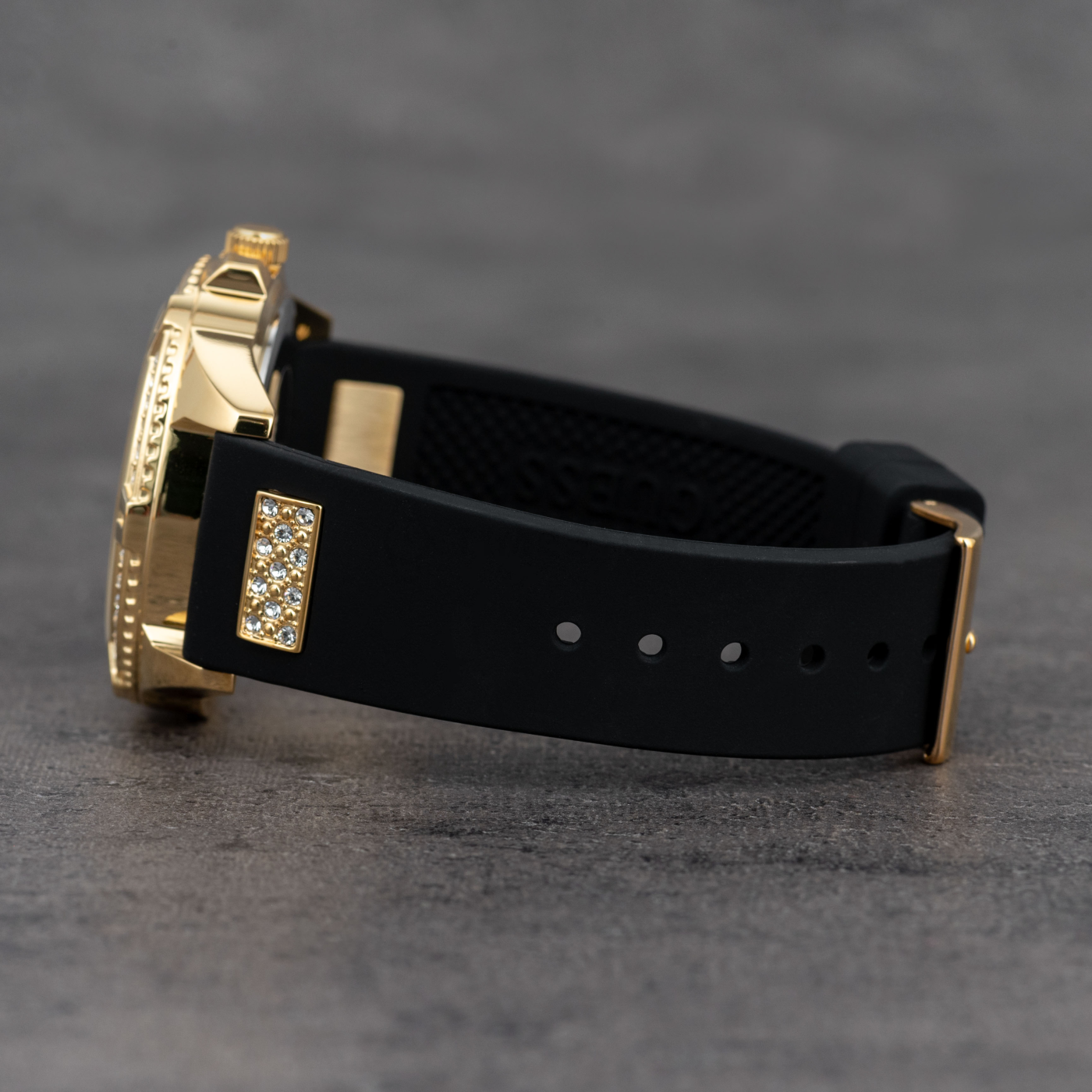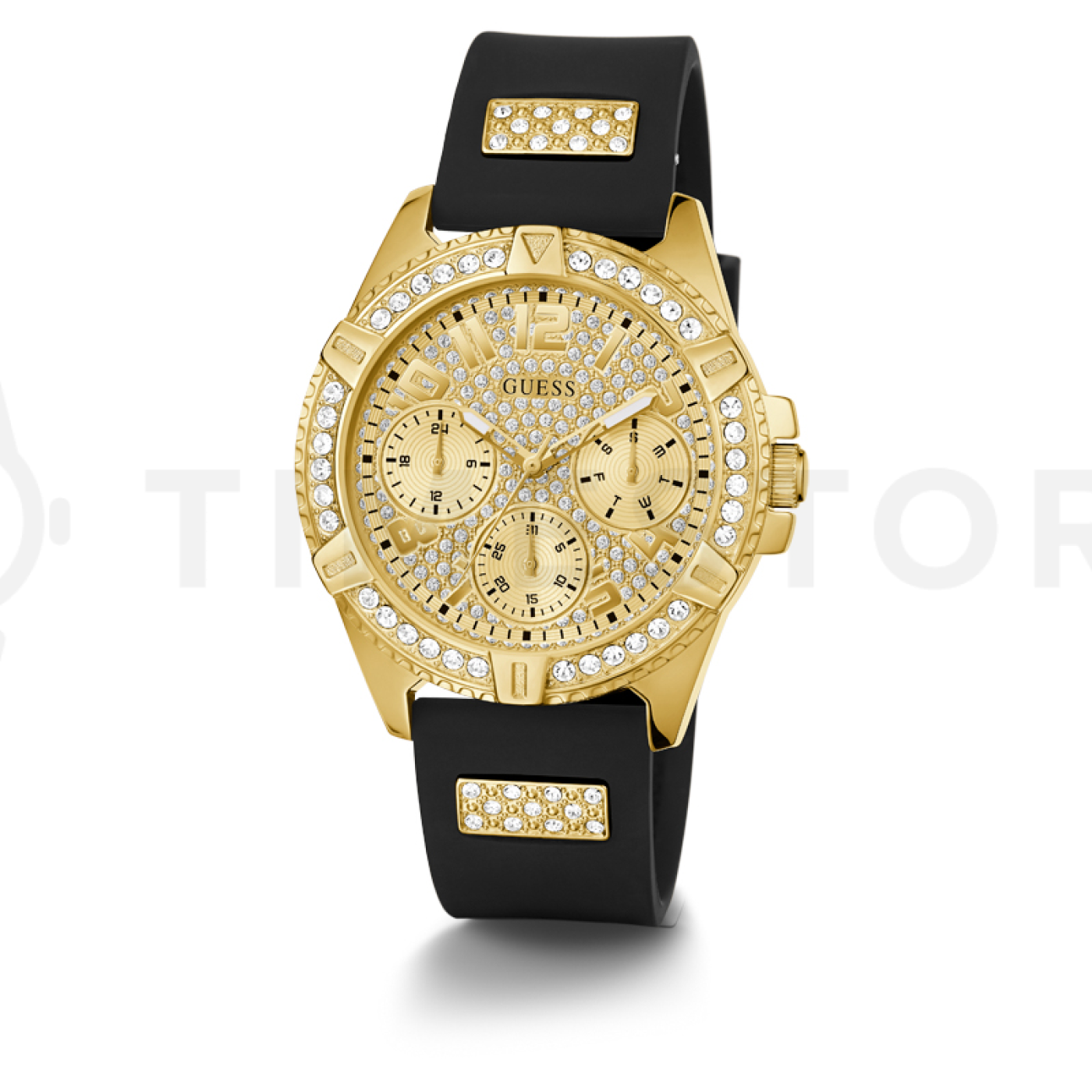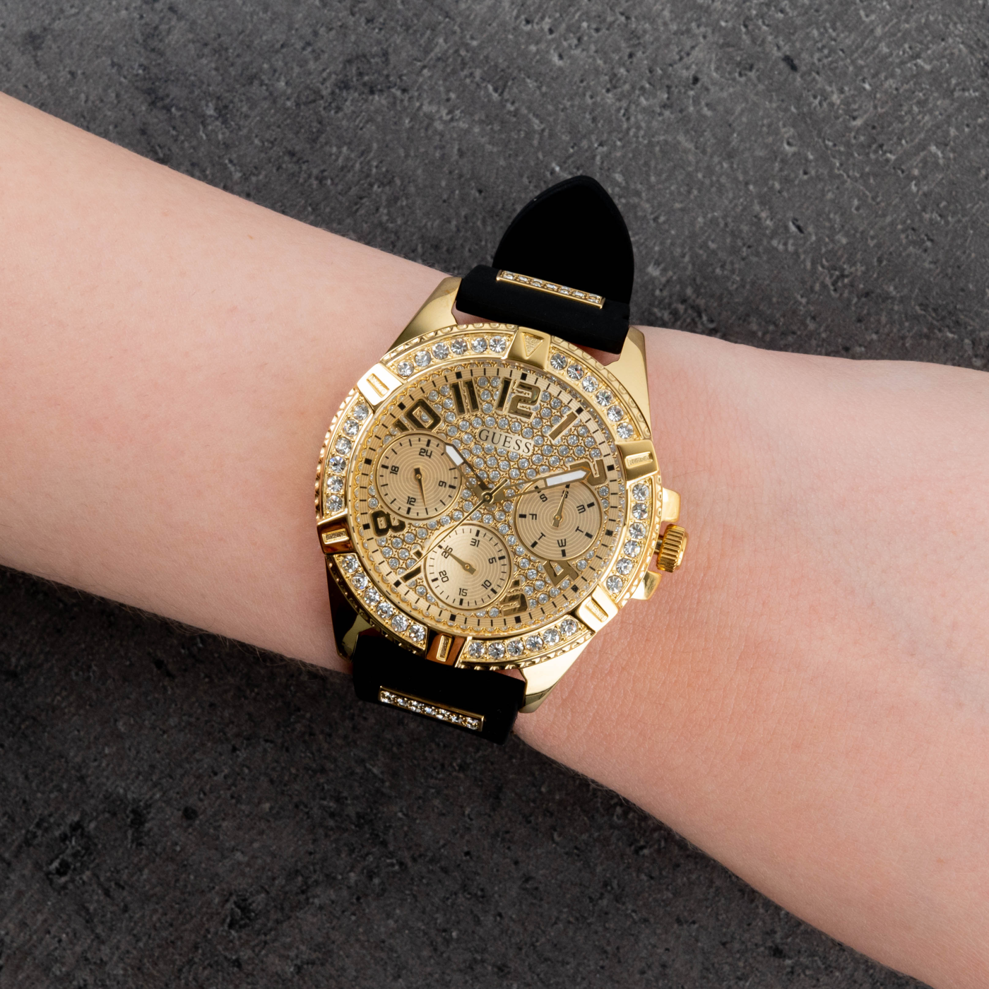 Ez a mesés karóra elbűvölte Önt a Guess-től? Az ábrázolt Guess W1160L1 karóra jól átlátható számlappal rendelkezik, amelynek színe arany, és a nagysága 40 x 12 mm. E darab érdekes számlapját egy szilárd acél PVD bevonattal tok őrzi amelynek színe ennél a darabnál exkluzív arany. Az óra elengedethetetlen eleme feltétlenül a szíj. A W1160L1 jelzésű darab szíjának anyaga kaucsuk alkotja. Ahogy nyilván Ön is szemügyre vette, a szíj színe fekete. Egy szó mint száz ez a mutatós női Guess karóra valóban egy jó minőségú érdekes darab.